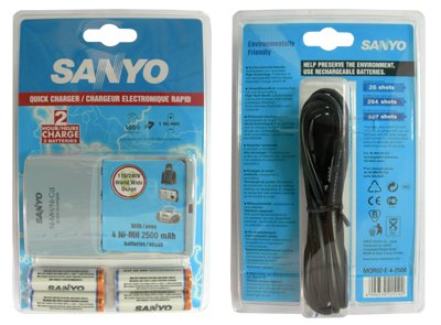 Ταχυφορτιστης επαναφορτιζόμενων μπαταριών HR06/AA 2500mAh SANYO.Φορτίστε εύκολα και γρήγορα τις μπαταρίες σας τύπου ΑΑΑ και ΑΑ. Στην συσκευασία περιλαμβάνονται 4 μπαταρίες ΑΑ 2500mAh.