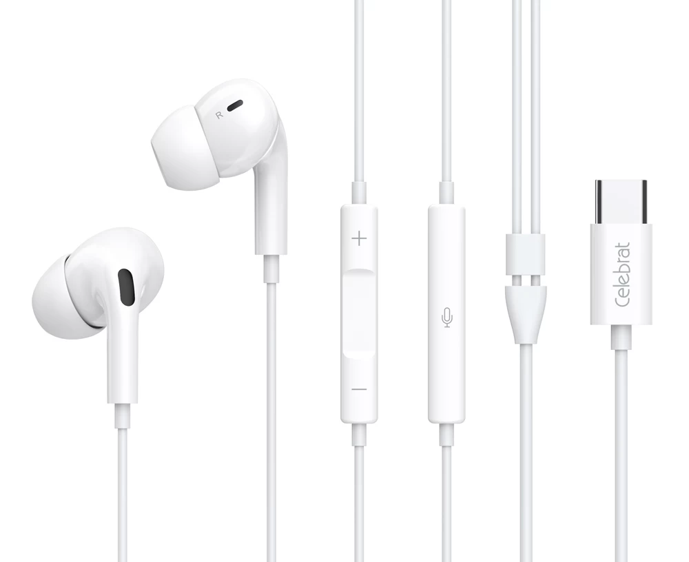 CELEBRAT earphones με μικρόφωνο E300, USB-C σύνδεση, Φ10mm, 1.2m, λευκά