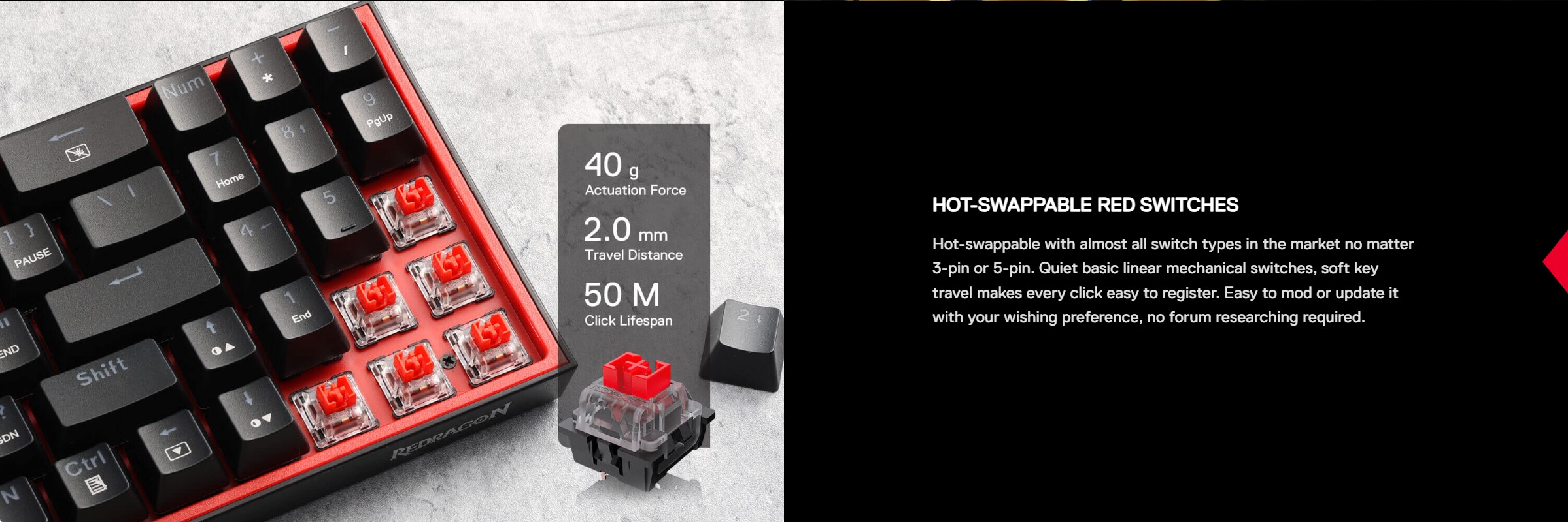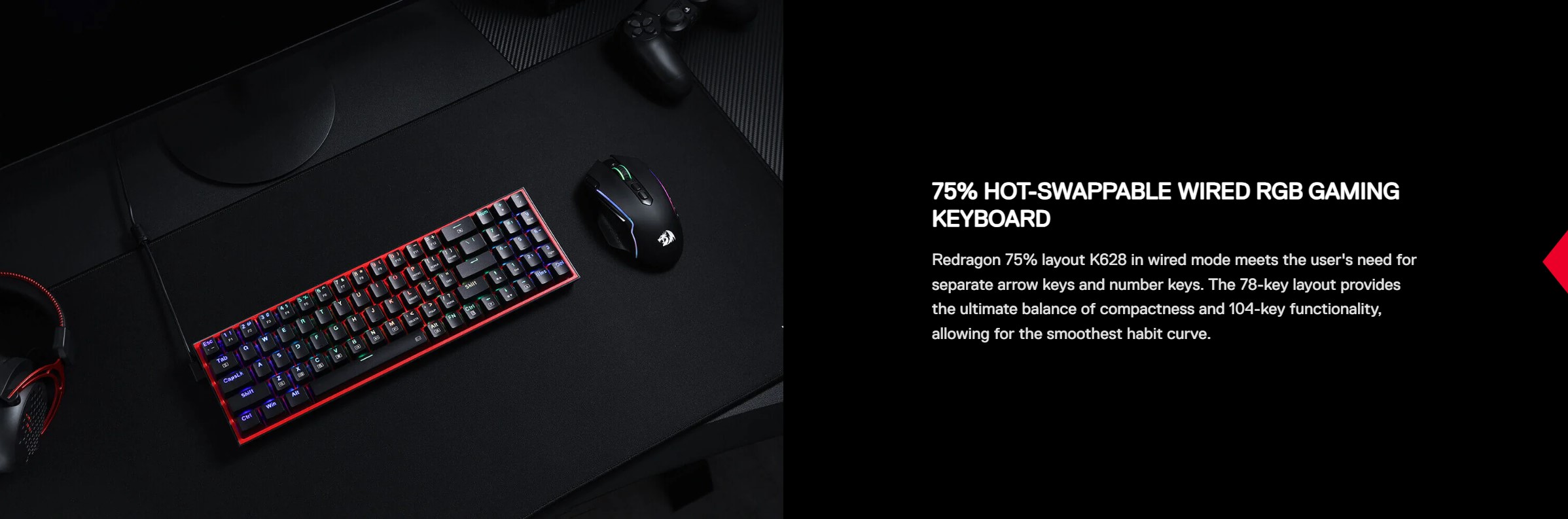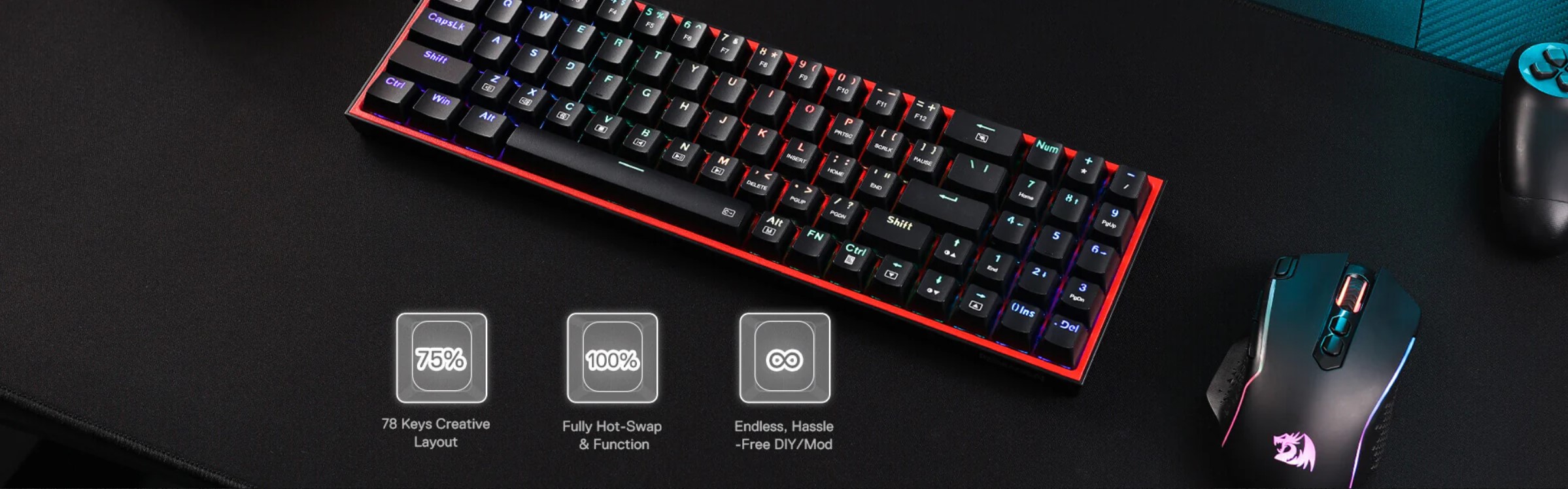 Redragon K628 RGB Pollux 75% 3-mode USB-C wired, Gaming Πληκτρολόγιο με 78 Hot-Swappable κόκκινους μηχανικούς διακόπτες σε χρώμα Μαύρο.