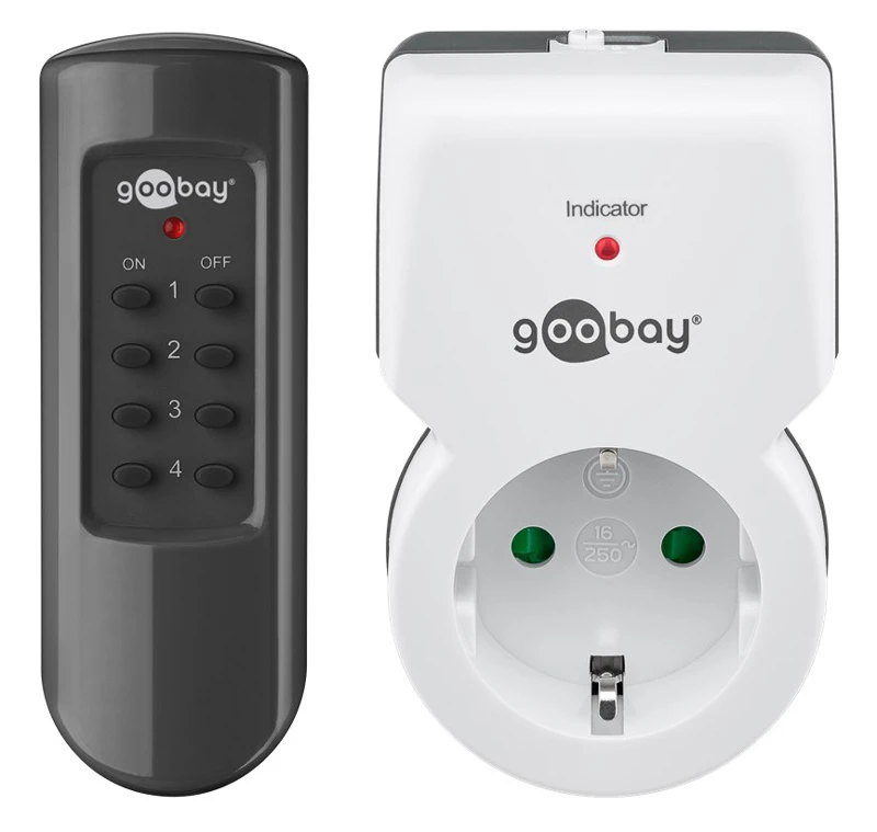 Σετ ραδιοελεγχόμενος αντάπτορας ρεύματος της Goobay, κατάλληλος για πρίζες σε εσωτερικούς χώρους που η πρόσβαση τους είναι δύσκολη.